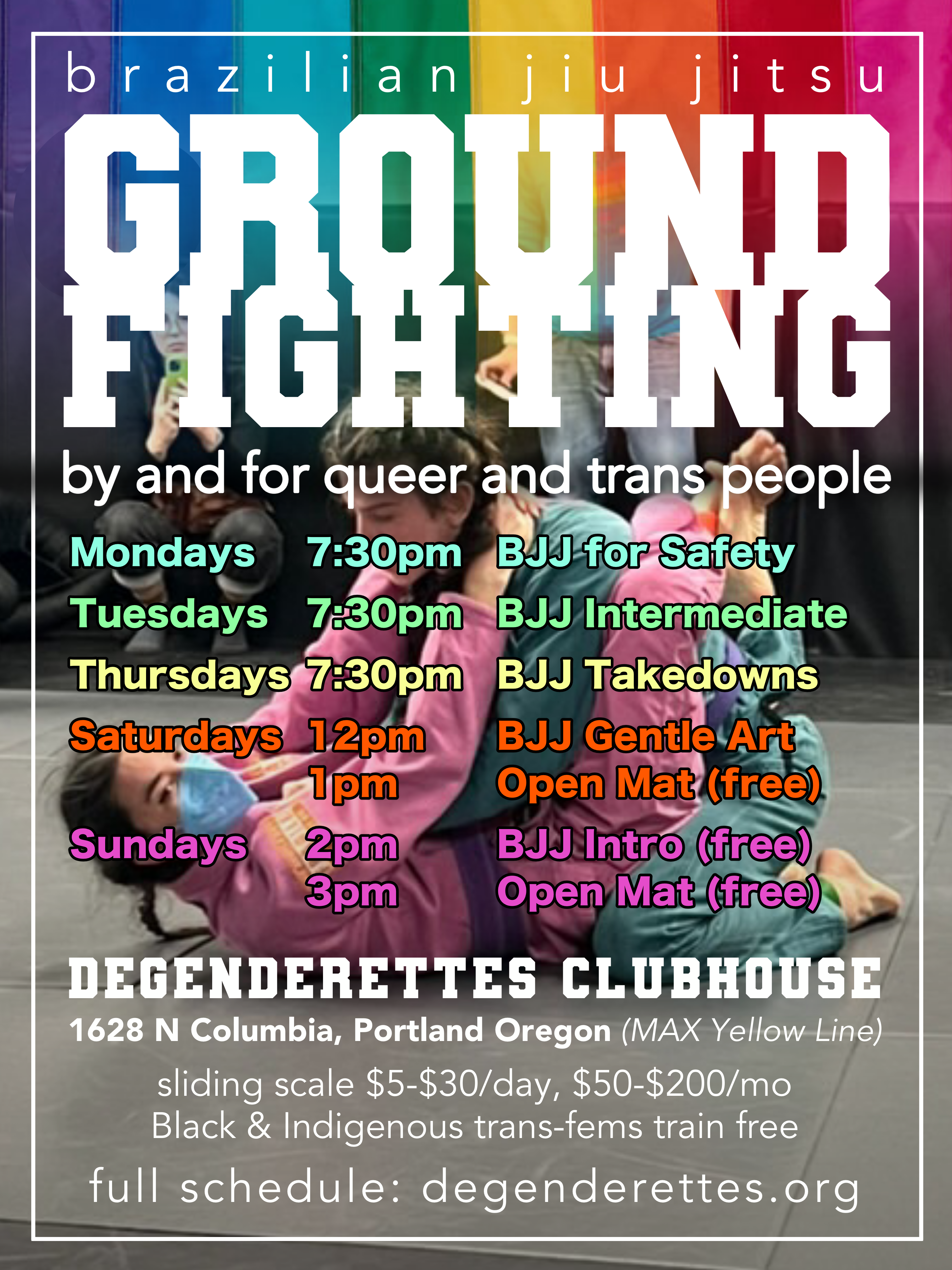 Free community sessions are in orange on the calendar, everything else is subject to paying Dues. Black and Indigenous trans-fems train free.